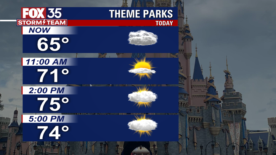 THEME PARKS: Fantastic weather is expected at the theme parks today. Highs will top out near 77 with partly cloudy skies this afternoon.