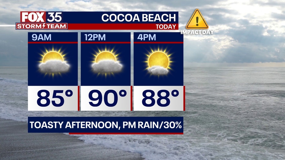 OUTLOOK: Central Florida can expect a hot weekend ahead. Afternoon highs soar to the upper 90s with heat index readings in the 107-112 degree range on Saturday and Sunday. Rain chances will rise a bit by the weekend with coverage in the 40-50% during this time. Download the FOX 35 Storm Team weather app to time out temperatures in your neighborhood.