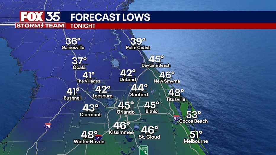 ORLANDO, Fla. - What to expect: Temperatures will remain chilly through the overnight with mainly clear skies. Lows will be in the upper 30s and through the 40s across the region. Cooler air keeps streaming into the region will keep our temperatures cool through the rest of the work week. Temperatures stay in the 60s and lows in the 40s for the rest of the workweek.