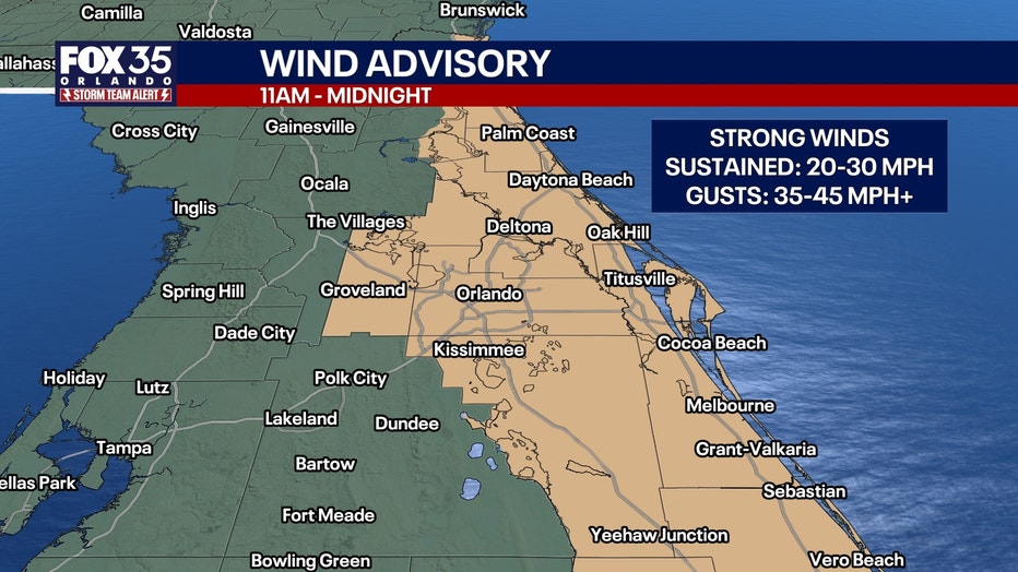A Wind Advisory is in place from 11 a.m. today until midnight for just about all of Central Florida to account for sustained winds of 20 to 30 mph and peak gusts of 35–45 mph. The strongest winds will happen near and along the coast, where isolated gusts could reach speeds of 50 mph.