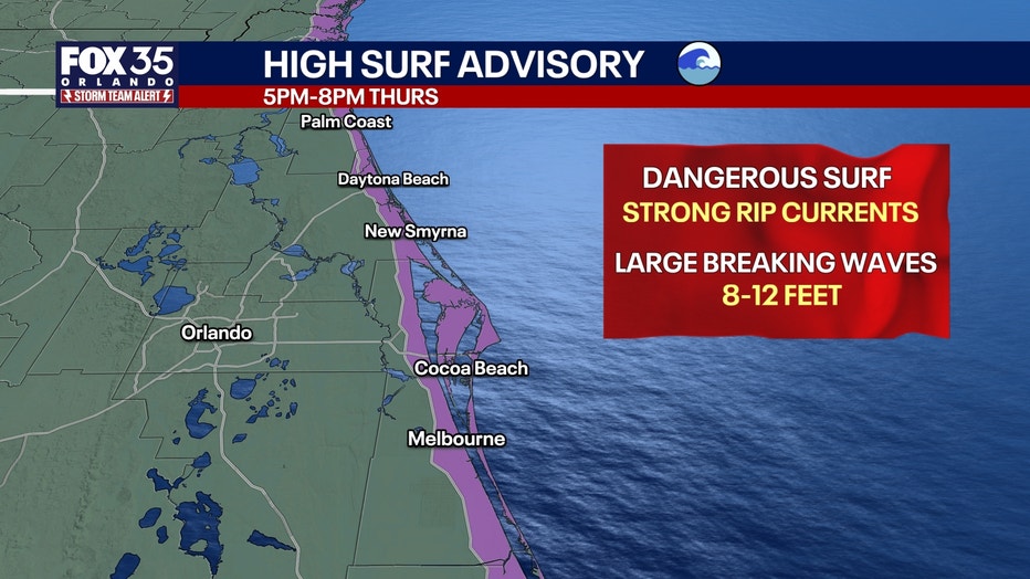 High Surf Advisory: In place from 5 p.m. Tuesday until 8 p.m. Thursday for Brevard, Volusia, and Flagler counties. As onshore winds increase, dangerously rough surf is likely. Large breaking waves will be as high as 8–12 feet.