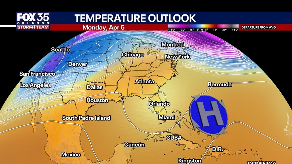 LONG RANGE: Warm high pressure moves in for the first week of April, pushing temps some 10° above normal. That'll equate to highs closer to 90°.