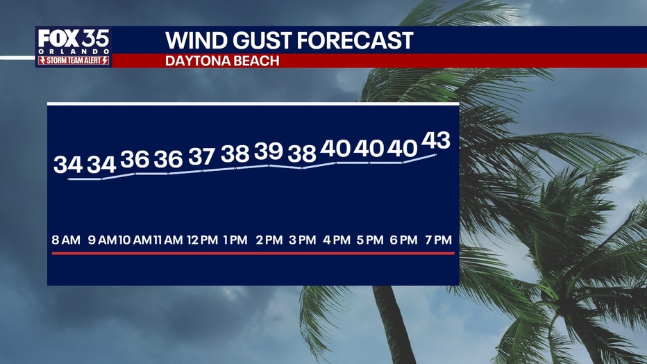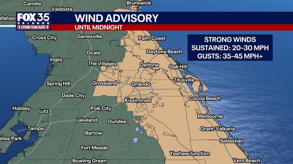 A Wind Advisory is in place from 11 a.m. through midnight for just about all of Central Florida to account for sustained winds of 20-30 mph and peak gusts of 35-45 mph.