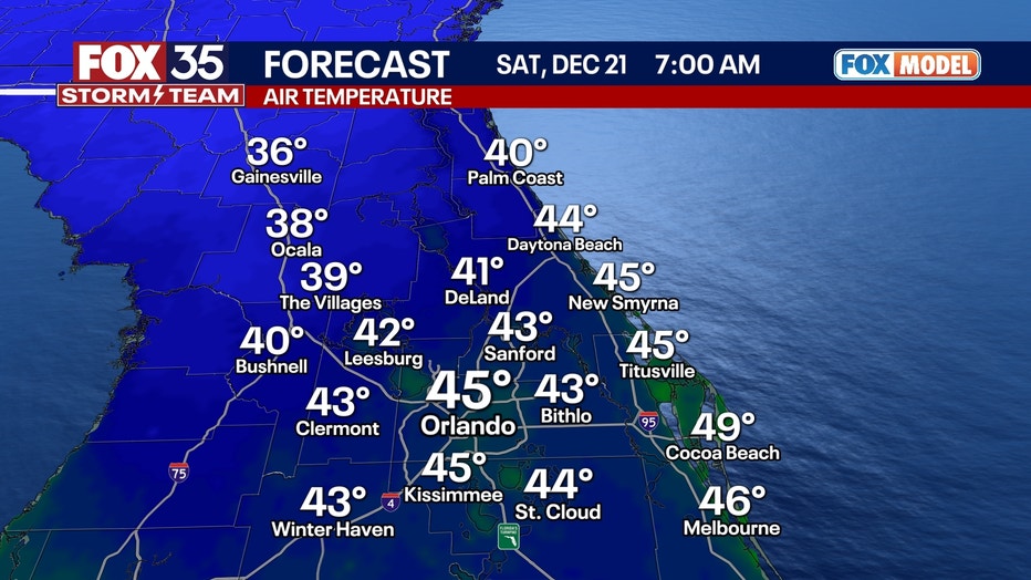 ORLANDO, Fla. - It will be clear and cold, with temperatures dipping into the mid-40s in Orlando overnight. Wind chills will make it feel like the mid-to-upper 30s.