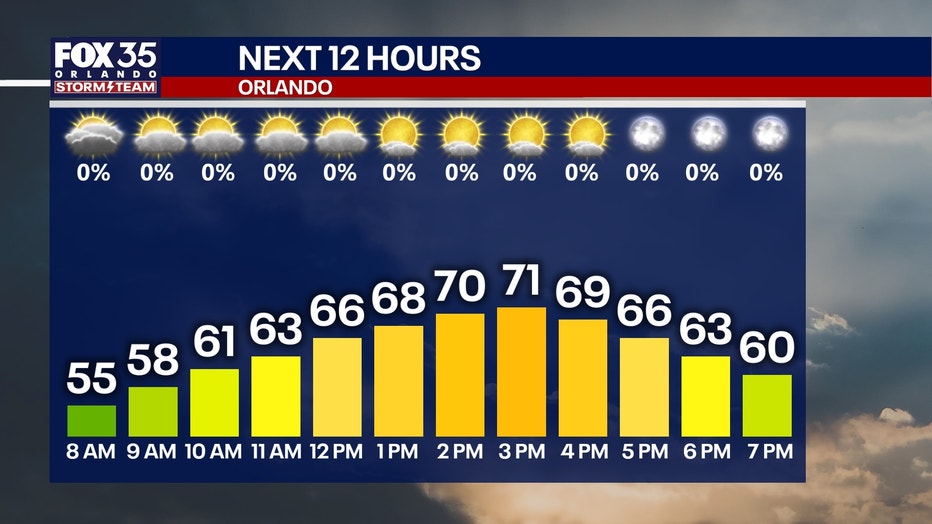 Our forecast high of 71° today in Orlando will still be around 4 degrees below our average high of 75°. Clouds will steadily break up throughout the day, giving way to a partly to mostly clear sky.