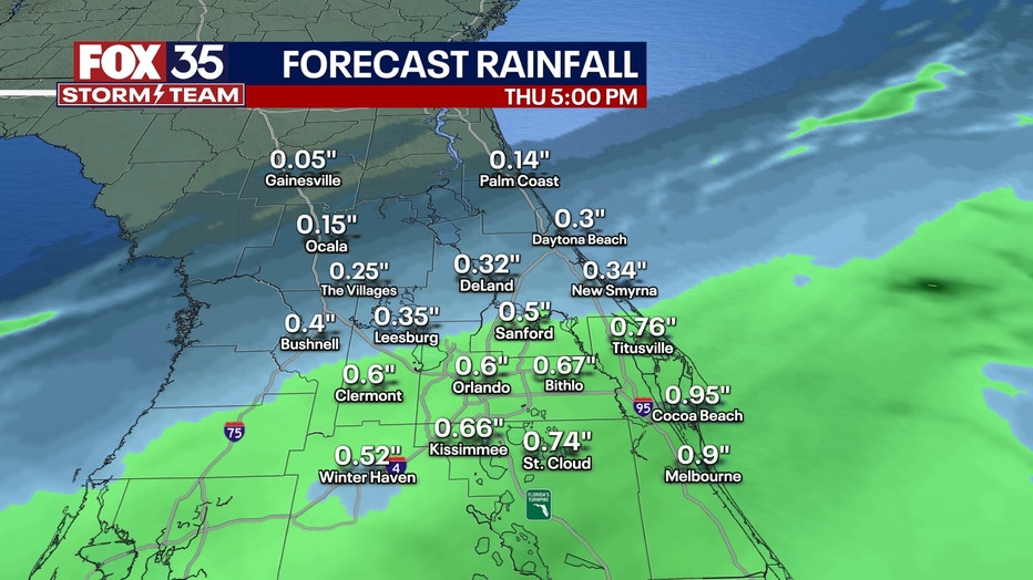 Rain in the morning-midday, with some moderate bursts possible in areas south or Orlando, particularly near Melbourne and Brevard County. Rain pushes off the east coast of FL by the early afternoon. Some dry time returns by mid-afternoon in most locations. A few more sprinkles or drizzle may return Thursday evening and the early part of the overnight. Rain totals of 1/2" or more are possible from Melbourne to Cocoa Beach to Winter Have. Rain amounts less than 1/2" areas from Daytona Beach to Deltona to Lake Mary to Leesburg and Ocala-Gainesville.