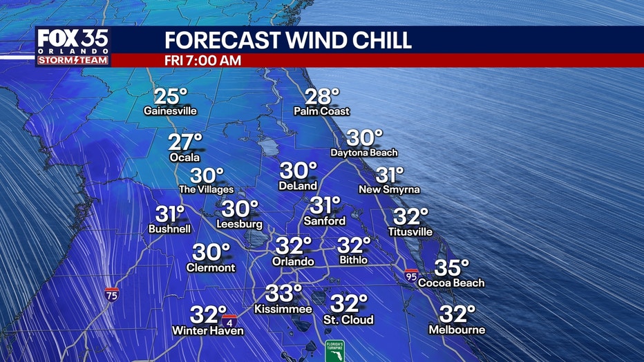 Most areas will stay above freezing; however, a few spots in Marion and northern Sumter to Lake counties could see temperatures fall near freezing in the low 30s.