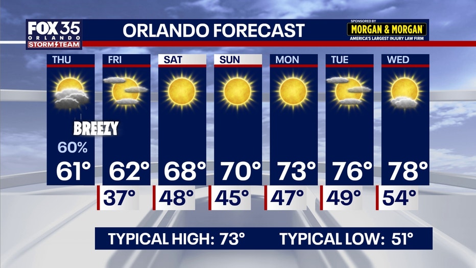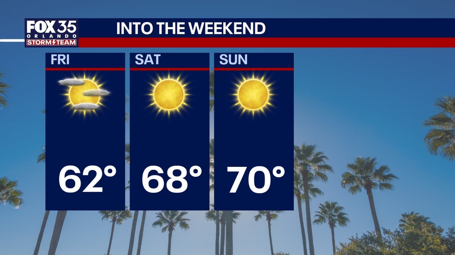 We'll end the work week on a cooler-than-normal note across Central Florida with highs only reaching the low to middle 60s tomorrow afternoon under mostly sunny skies.