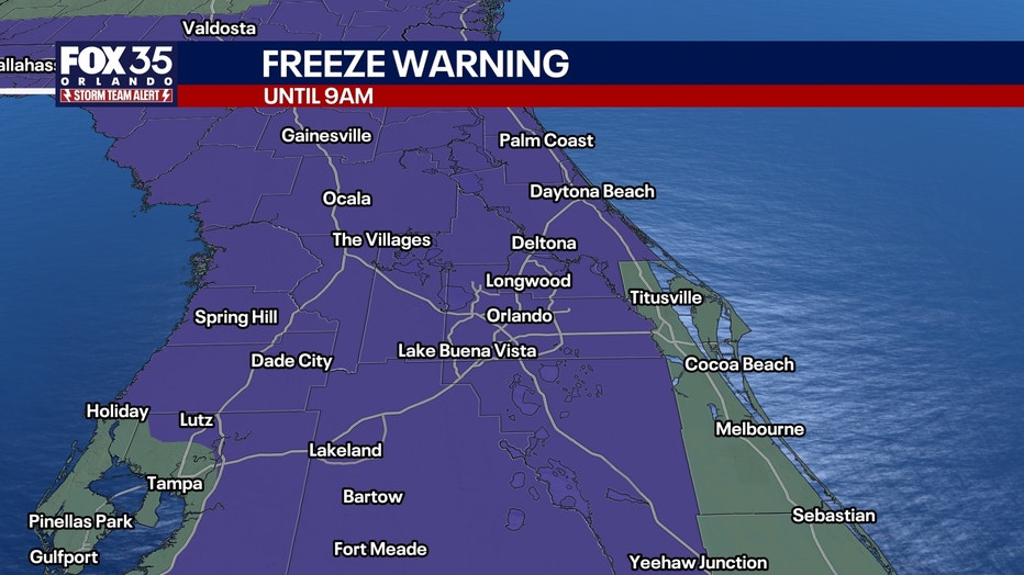 A Freeze Warning is in place for all counties (except Brevard) until 9 a.m. Mostly sunny skies will prevail despite a few clouds this morning.