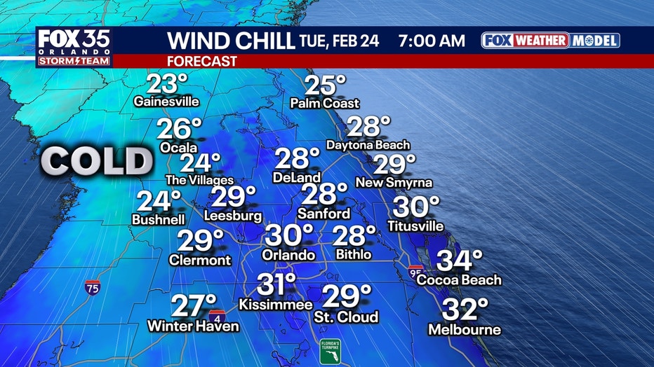 Winds both Sunday, as the front moves through, and Monday will be gusty with winds 20–25 MPH. With that in mind, Monday AM temps will feel like the 30s in Orlando and the 20s in Ocala and Gainesville.