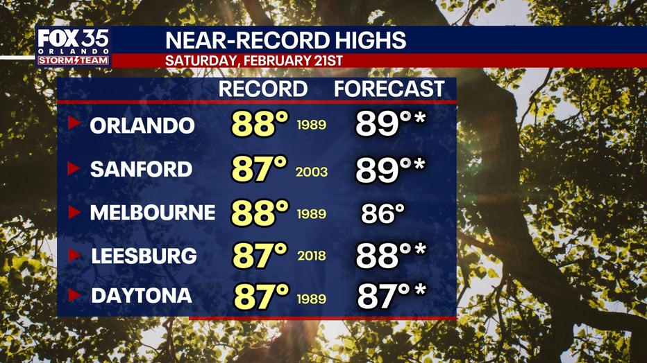 Temperatures will continue to stay warm with a high on Saturday of 88 degrees. On Saturday we will be flirting with daily record highs (the Feb. 21 daily record high in Orlando was 88 degrees set back in 1989).