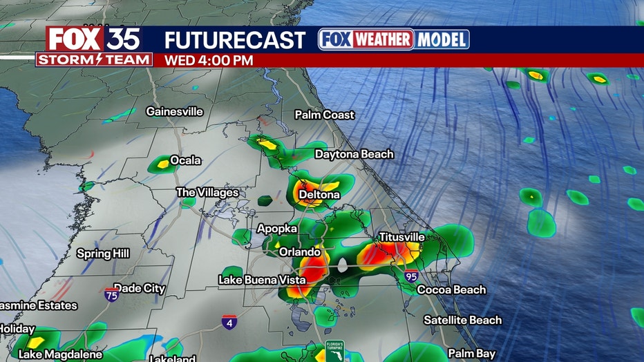 Scattered downpours and thunderstorms are expected through the evening and into the early overnight hours, with the highest chances near the beaches and along the I-4 corridor.