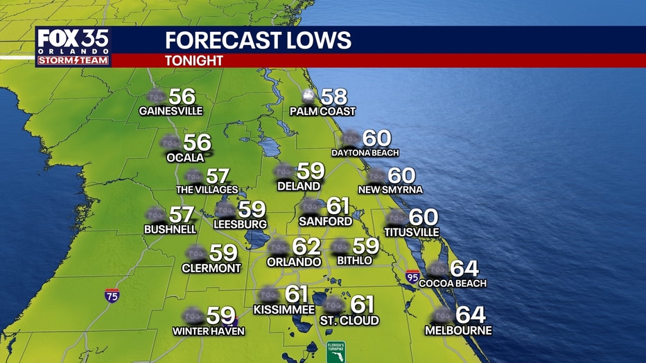 High pressure is firmly in control of the Southeast, including Central Florida. Overnight lows look to dip back to near 60 degrees which is just a touch above average for this time of year.
