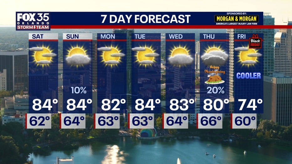 Chillier air does look to sink in just in time for Black Friday shopping, with highs during the afternoon in the 60s to 70s. Lows will be cooler too, so be sure to grab a jacket. Overnight readings could be back into the 40s-50s into Saturday morning.