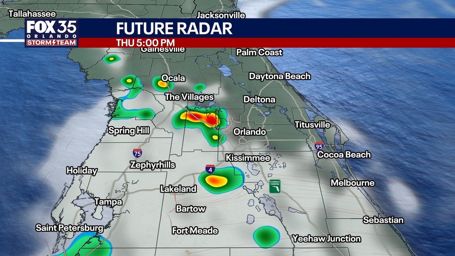 Storms may develop along I-75 and near the Tampa area around commute time, but those will move west and away from Central Florida. A quick passing shower is possible from Orlando westward, but most areas stay dry.