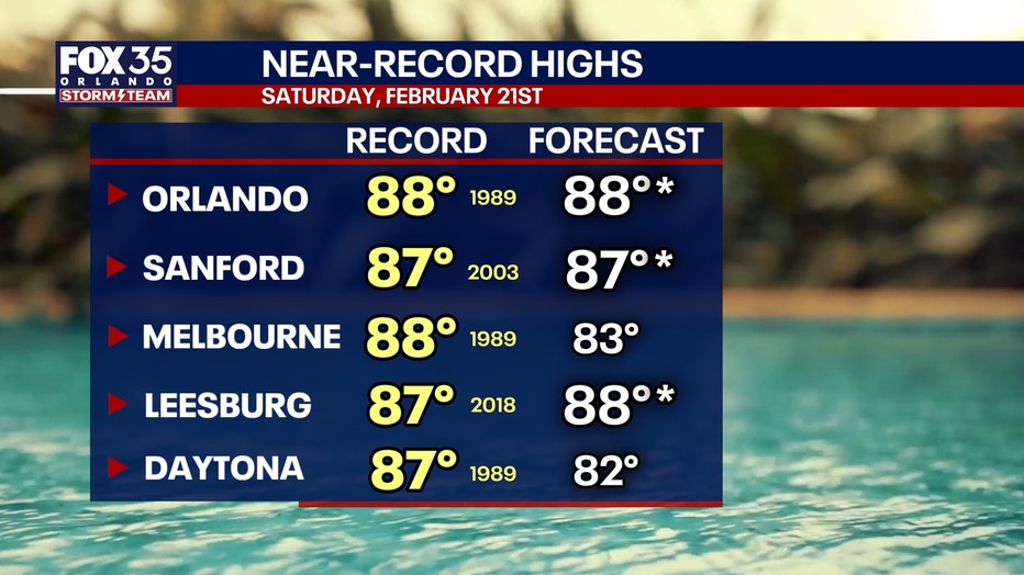 On Saturday we will be flirting with daily record highs (2/21 daily record high in Orlando is 88 degrees). Temperatures will be soaring above average for the next few days. Temperatures on average for this time of year linger in the mid 70s.