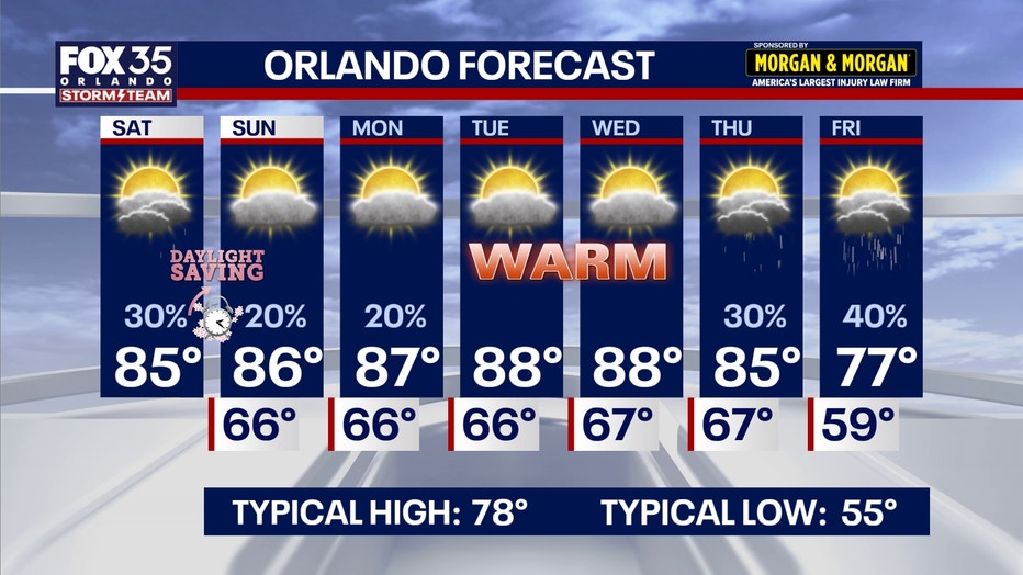 FOX 35 storm team meteorologist Jessica Dobson tracks a warm weekend starting with scattered afternoon storms.