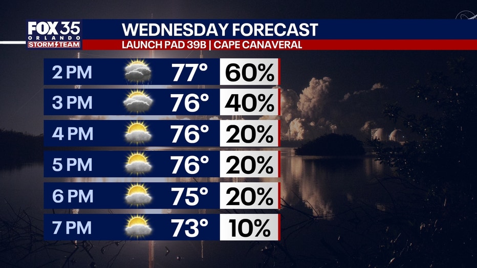 The first launch window starts on Wednesday, at 6:24 p.m., with a 2-hour window to launch. We are watching the likelihood of showers in the early-mid afternoon to impact Launch Pad 39B.