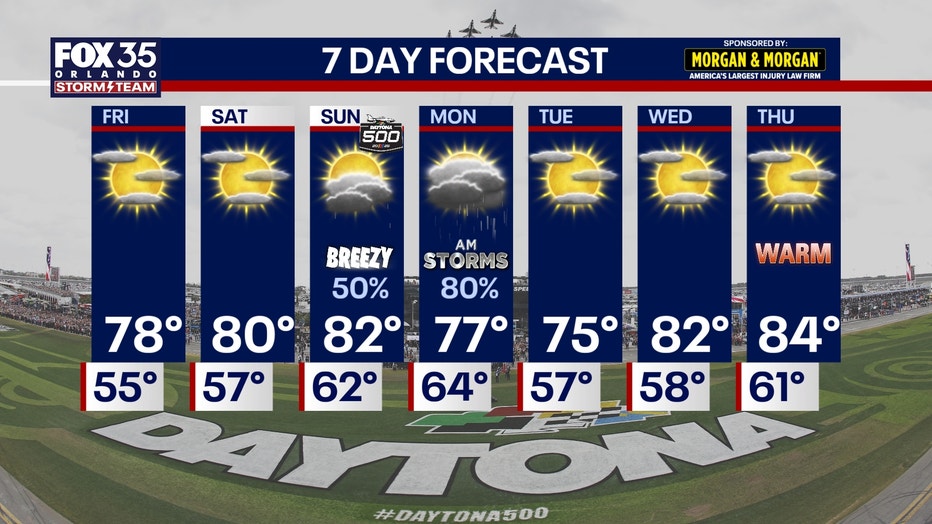 With the Daytona 500 taking place on Sunday, we're watching these rain chances and impacts closely. Winds will be gusting up to 30 mph Sunday, which may affect drivers on the track.