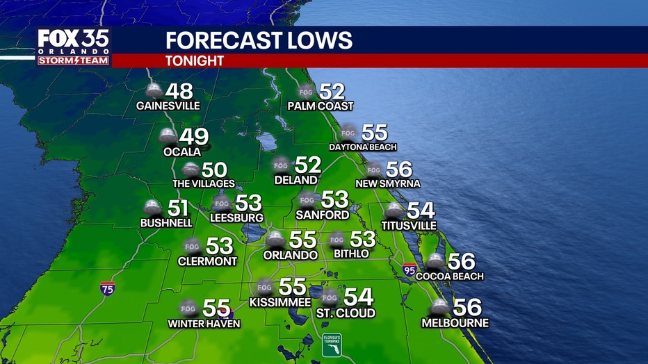 Low temperatures on Friday mooring will dip into the upper 40s to mid 50s for most of the region before warming up to near 80 degrees around Orlando.