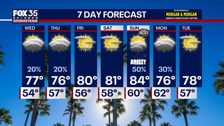 Sunny and warmer conditions return Friday and Saturday, with highs near 80 degrees Friday and in the low 80s Saturday. Both days are forecast to remain dry. Gusty winds and temperatures in the low to mid-80s are expected Sunday ahead of another approaching cold front across central Florida.