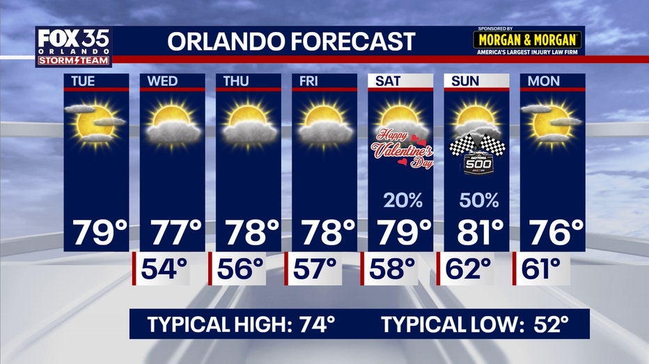 We look to stay mostly dry as well until changes arrive this weekend. Shower and storm chances will be on the rise for Saturday and Sunday, which isn't ideal given it's the Daytona 500 weekend.