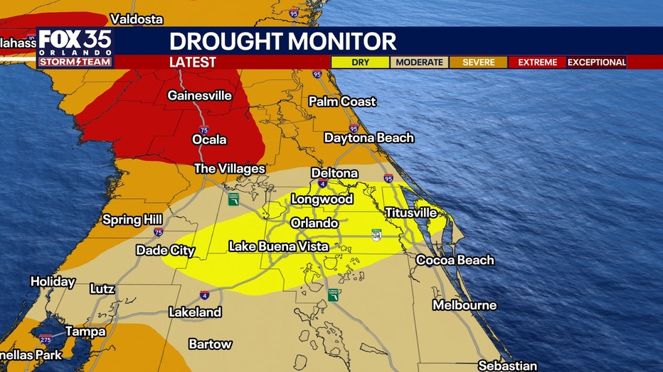 Meanwhile, drought conditions continue to worsen across central Florida. Extreme drought now extends from Gainesville to Ocala and The Villages.
