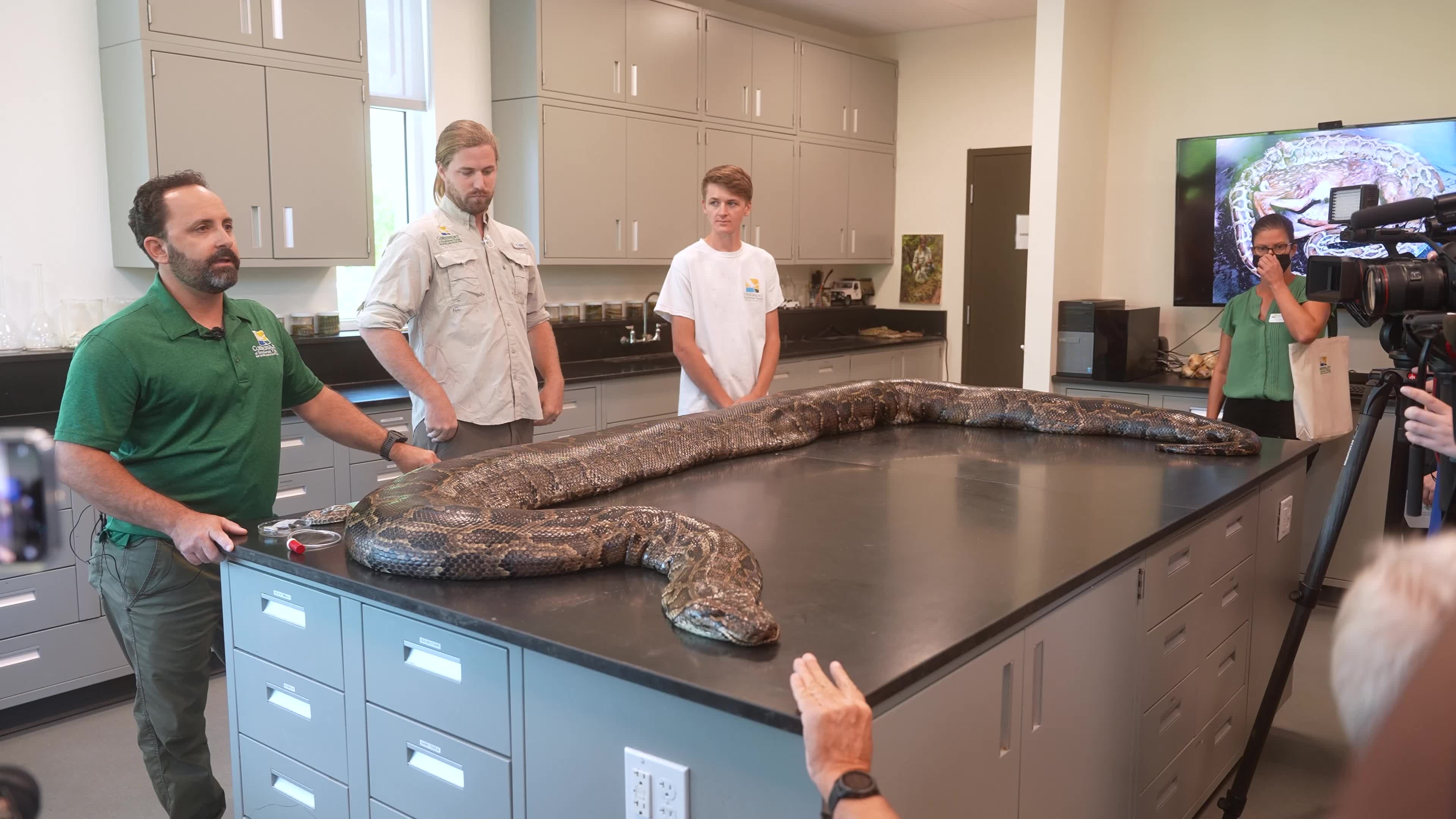 LAKE MARY, Fla. - The Conservancy of Southwest Florida on Wednesday unveiled the largest python yet to be captured in the state. The reptile measures nearly 18 feet in length and weighs 215 pounds, the agency said during a news conference.