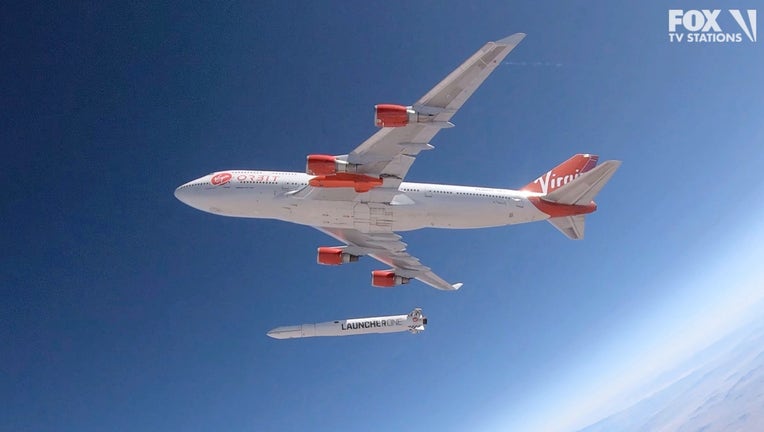 In this photo provided by Virgin Orbit, a rocket is dropped from a Boeing 747 airplane flying above Edwards Air Force Base in California, Wednesday, July 10, 2019. The "drop test," which did not involve firing the rocket motor, was part of a test of