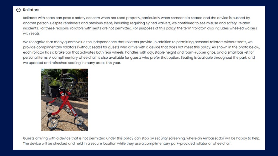 It appears that SeaWorld Orlando has updated how its new policy reads on its website to better clarify why it made the change, and solutions for guests who show up to the park with the now-banned device. It also includes a photo of what the complimentary walker looks like.