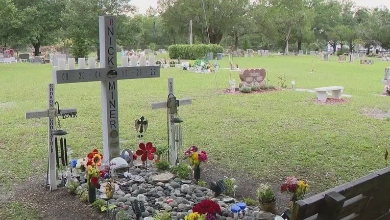 Miner's son Nick, an East River High School quarterback killed in an accident last year, is buried at the Chuluota Cemetery.
