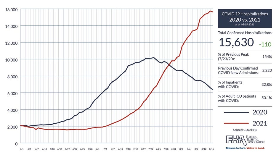 The current hospitalizations are 154% higher than the previous peak on July 23, 2020, the Florida Hospital Association explained. They released a chart comparing last year's numbers to this year's numbers.