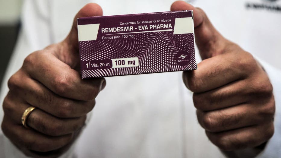 FILE - An employee of Egyptian pharmaceutical company Eva Pharma holds a pack containing vials of Remdesivir.