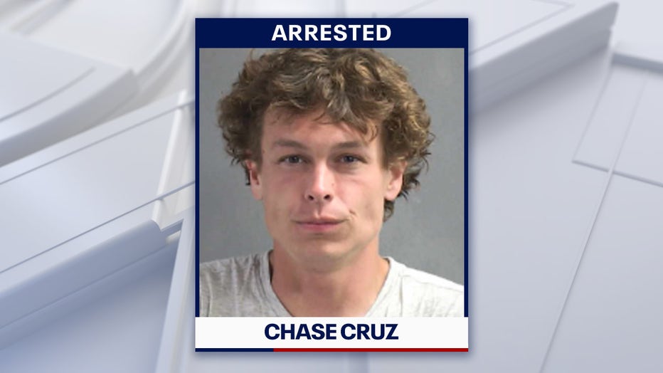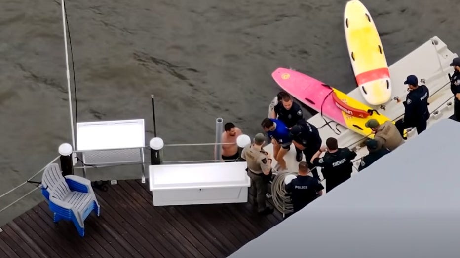 Officials said the suspect, identified as 28-year-old Chase Cruz, was located in the water and brought back to shore without further incident.