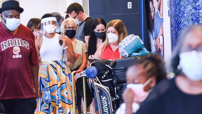 People wearing facemasks line up at a COVID-19 testing site at Orlando International Airport. The Florida Department of Health reported 134,506 new cases of COVID-19 within the state over the past week. (Photo by Paul Hennessy/SOPA Images/LightRocket