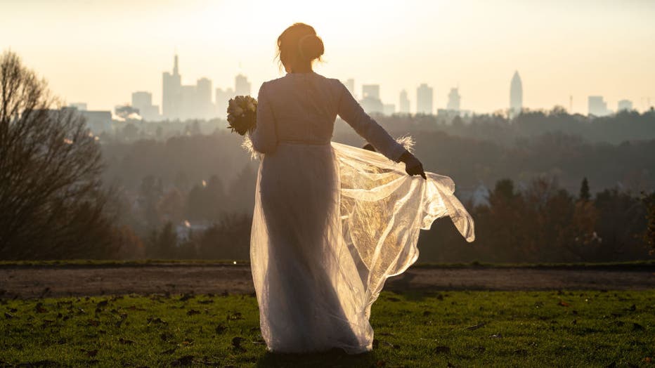 27 November 2020, Hessen, Frankfurt/Main: A bride poses in the light of the afternoon sun in front of the city skyline on the Lohrberg for the wedding photographer (not in the picture). Photo: Frank Rumpenhorst/dpa (Photo by Frank Rumpenhorst/picture