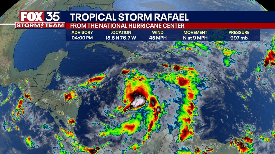 Rafael is expected to stay more than 250 miles west of Florida's Gulf Coast, which means no direct impact to Central Florida is expected, though it will bring rain to the area mid-week.
