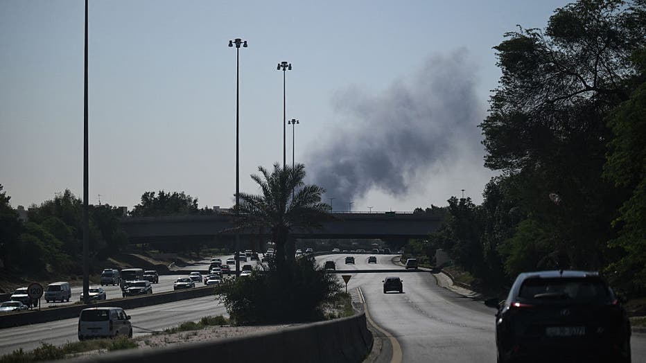 Motorists drive along a street as smoke rises from a reported Iranian strike in the area where the US Embassy is located in Kuwait City on March 2, 2026. Black smoke was seen rising from the US embassy in Kuwait City on March 2 after the latest volle