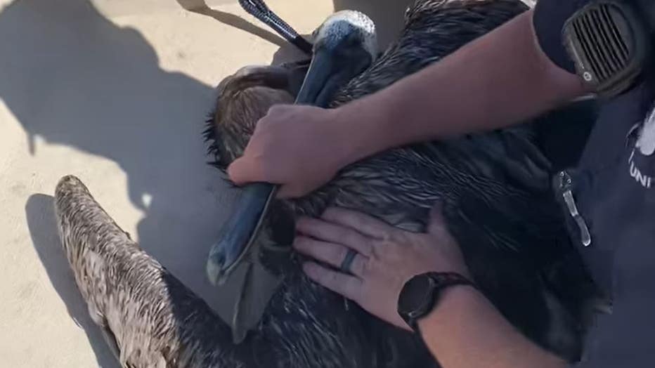 ST. PETERSBURG, Fla. - St. Petersburg police officers rescued a pelican that got entangled in some fishing line and a hook in the waters in Tampa Bay.