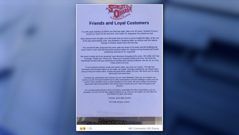 "This wonderful little restaurant has seen quite her share in 50 years and the building that much more in over 100!" says Scarlett O'Hara's. "We know that whoever takes charge moving forward will create something amazing for St. Augustine."