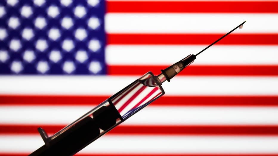 Medical syringe is seen with American flag in the background in this illustration photo taken in Poland on November 23, 2020. (Photo by Jakub Porzycki/NurPhoto via Getty Images)
