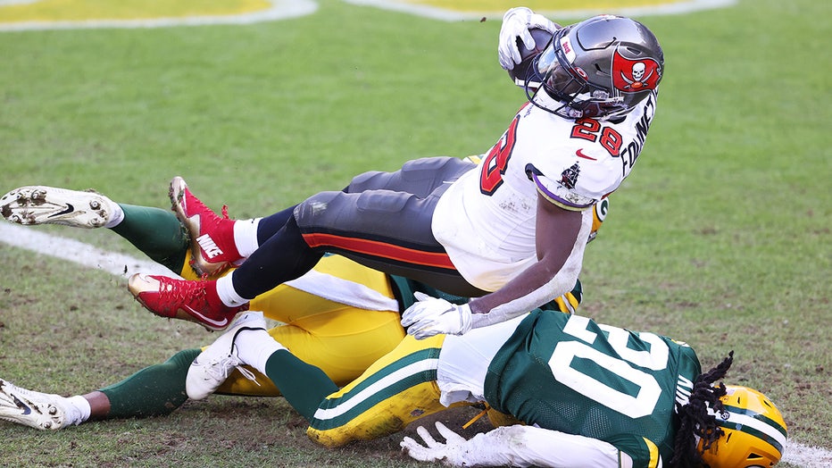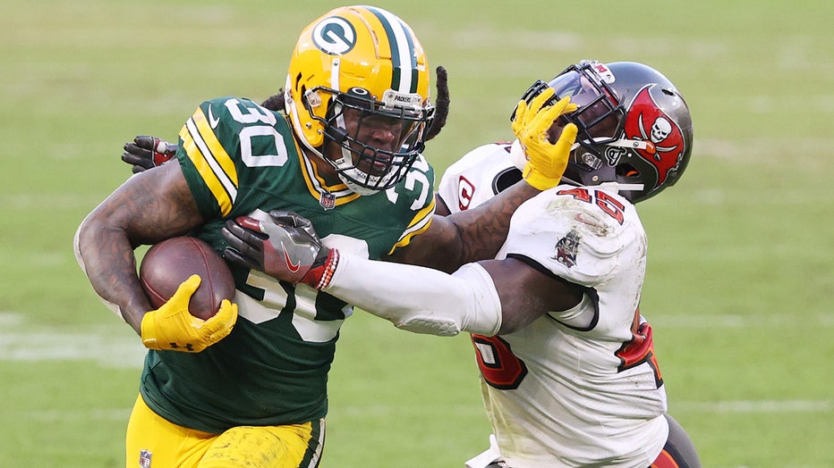 Jamaal Williams of the Green Bay Packers tries to avoid the tackle of Devin White in the third quarter (Photo by Dylan Buell/Getty Images).