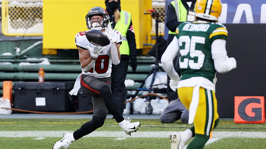 GREEN BAY, WISCONSIN - JANUARY 24: Mike Evans #13 of the Tampa Bay Buccaneers completes a reception for a touchdown in the first quarter against the Green Bay Packers during the NFC Championship game at Lambeau Field on January 24, 2021 in Green Bay,