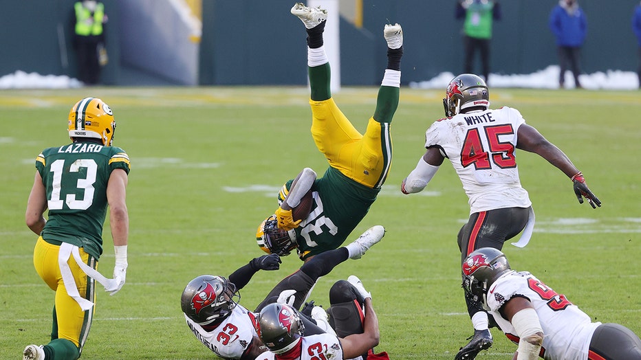 Jamaal Williams of the Green Bay Packers is tripped up by Jordan Whitehead. (Photo by Stacy Revere/Getty Images)