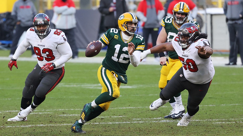 Aaron Rodgers of the Green Bay Packers scrambles in the third quarter against the defense of Vita Vea and Ndamukong Suh (Photo by Dylan Buell/Getty Images).