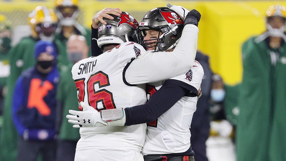 Tom Brady celebrates the 31 to 26 win over the Green Bay Packers with teammate Donovan Smith during the NFC Championship game (Photo by Stacy Revere/Getty Images).