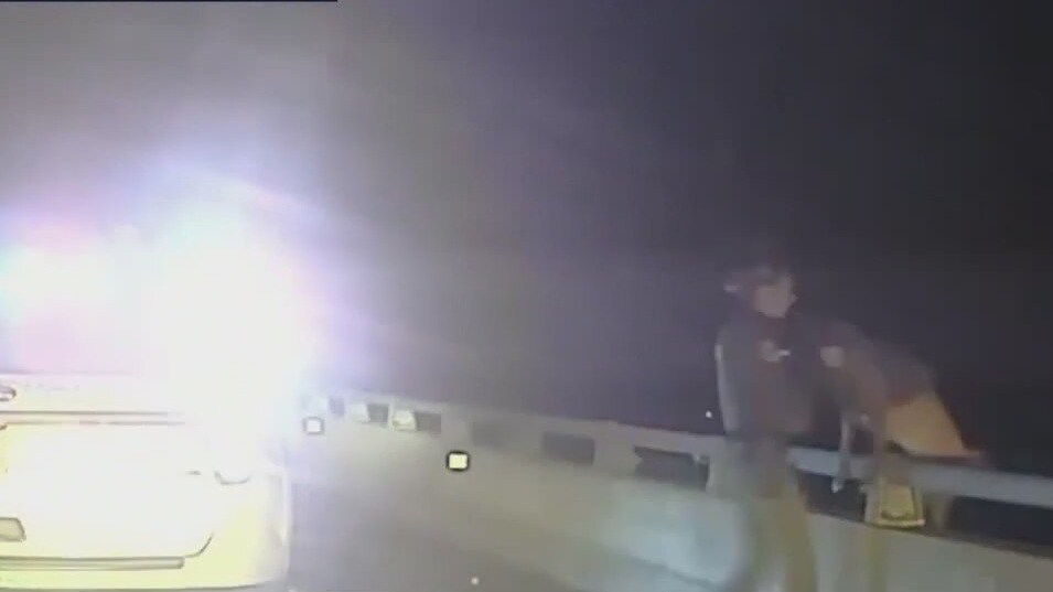 A deputy rushes to save a K-9 partner after the dog jumped over the rail of a bridge.