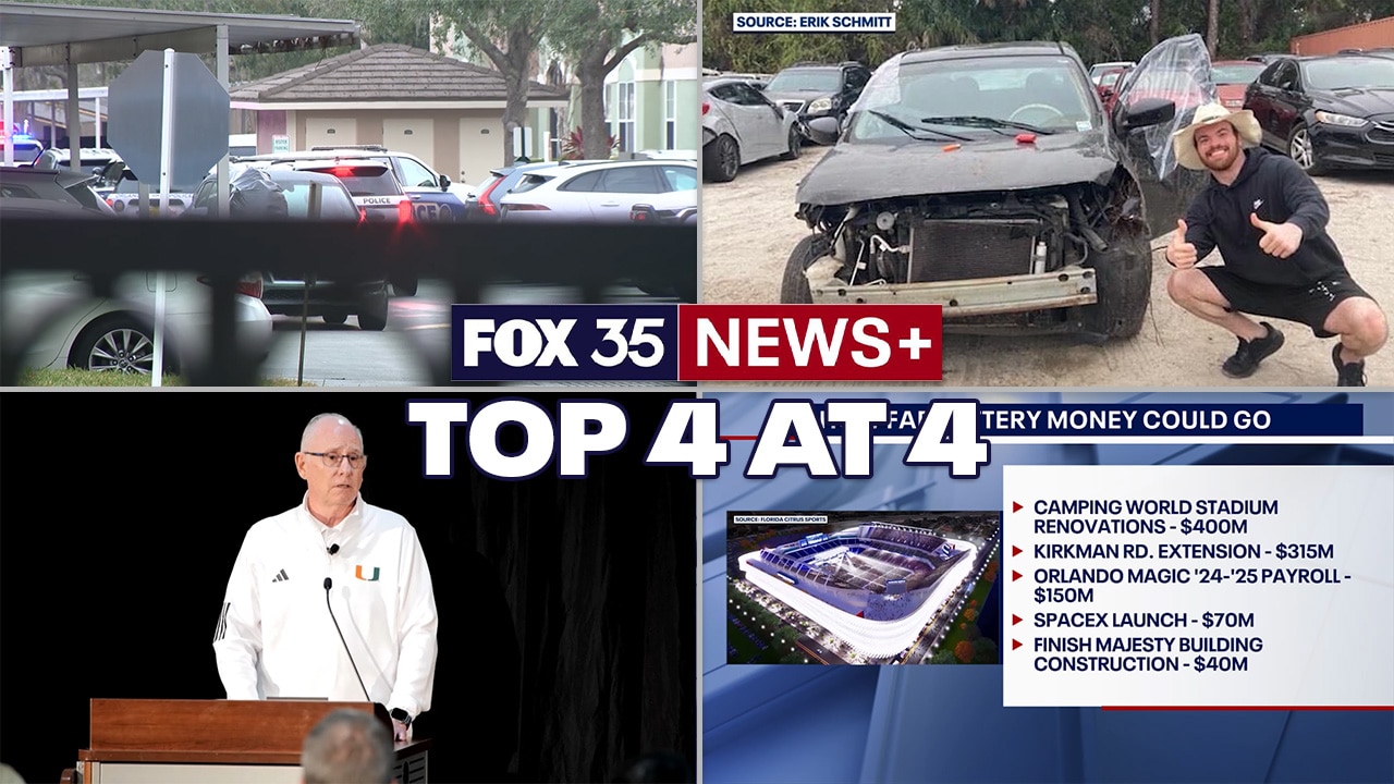 FOX 35's Manny Martinez joins FOX 35's Garrett Wymer to break down the top 4 news stories you need to know about today, including an off-duty corrections officer accused of shooting and killing an alleged car thief in Orlando, an Edgewater man accused of leading police in a high-speed chase with a stolen car with a long rap sheet, the Miami Hurricanes' basketball coach suddenly stepping down in the middle of the season, and the $1.15 billion Mega Millions Jackpot.