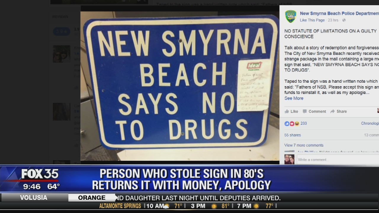 Stolen sign returned to city officials at New Smyrna beach after 30 years.