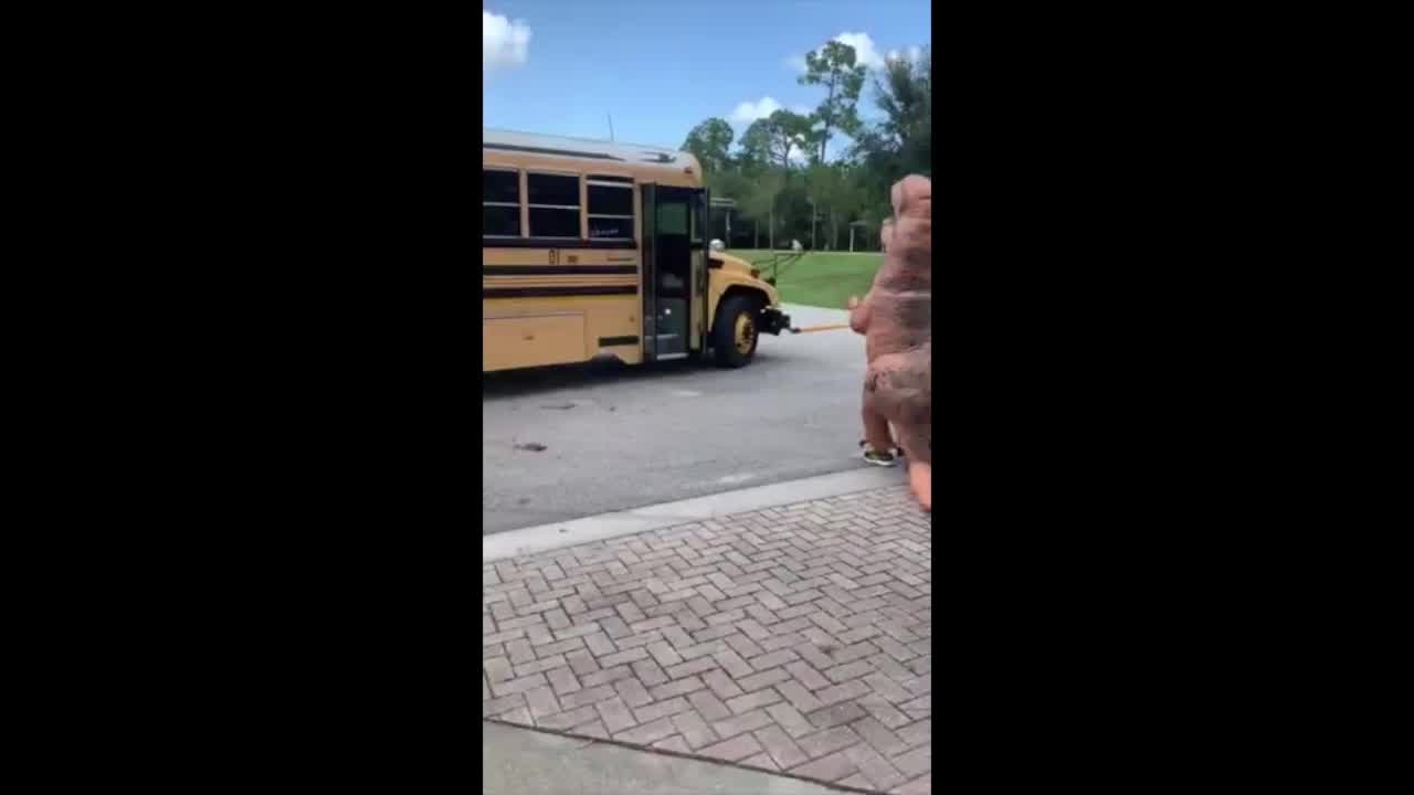 Dino-Mite foster parents embarrass Florida teens by meeting them at bus stop in T-Rex costumes